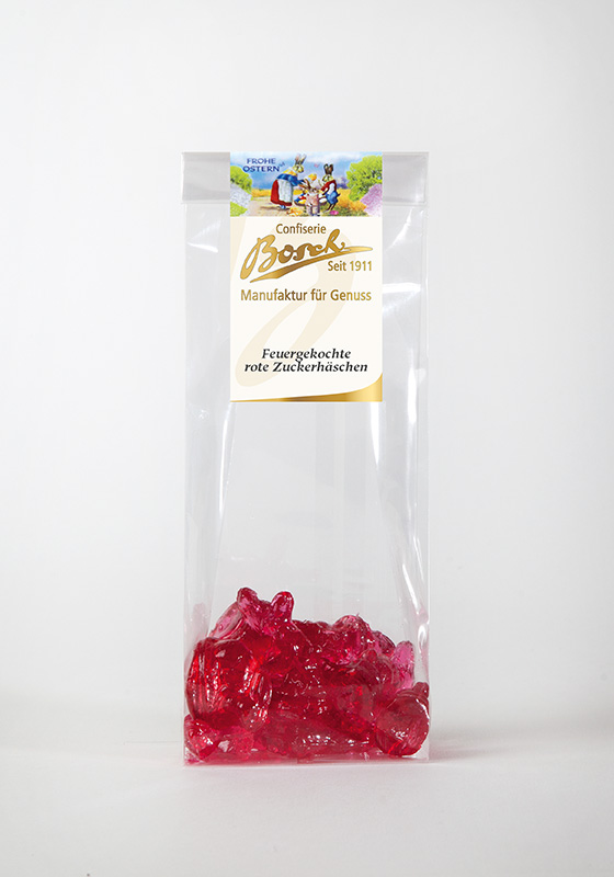 Feuergekochte rote Zuckerhäschen im Beutel
