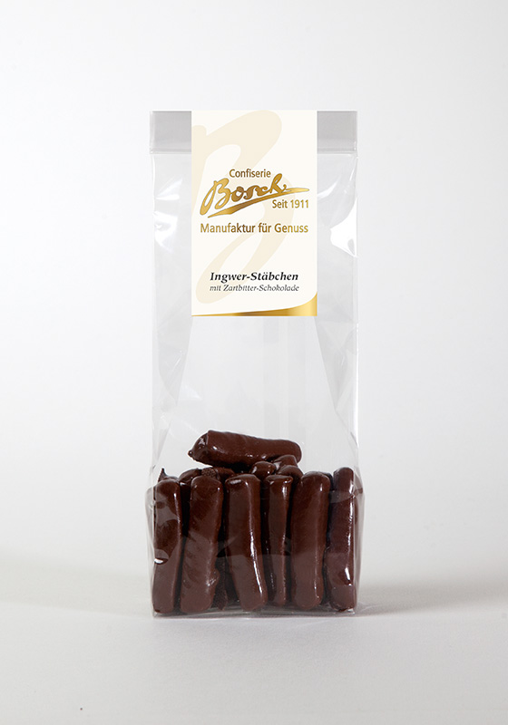 Ingwer 60 % (Ingwer (55%), Rohrzucker 45%), dunkle Schokolade, Kakao: 60 % mindestens (Kakaomasse, Zucker, Kakaobutter, Emulgator: Sojalecithin, Vanilleextrakt).