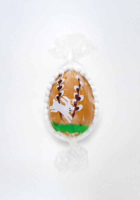 Gemenge aus blättrig geschnittener Mandel und karamellisiertem Zucker, zu einem eiförmigen, hohlen Gebilde ausgeformt, garniert mit einer Zubereitung aus festem, zuckrigen Eischnee