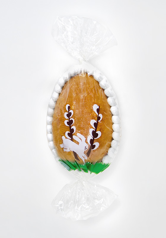 Gemenge aus blättrig geschnittener Mandel und karamellisiertem Zucker, zu einem eiförmigen, hohlen Gebilde ausgeformt, garniert mit einer Zubereitung aus festem, zuckrigen Eischnee