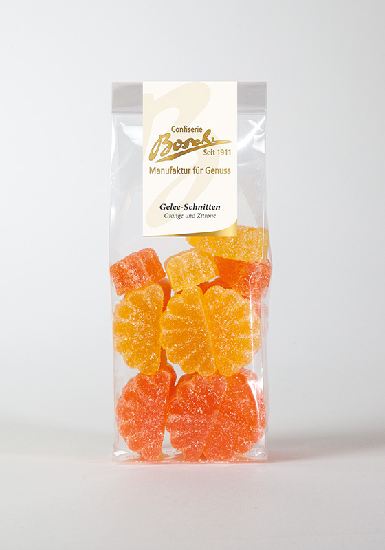Zucker, Wasser, Glukosesirup, Feuchthaltemittel: Sorbit, Geliermittel: Agar-Agar, Säuerungsmittel: Zitronensäure, Aromen: Zitrone, Orange; färbende Frucht-und Pflanzenextrakte: Kurkuma, Paprika.