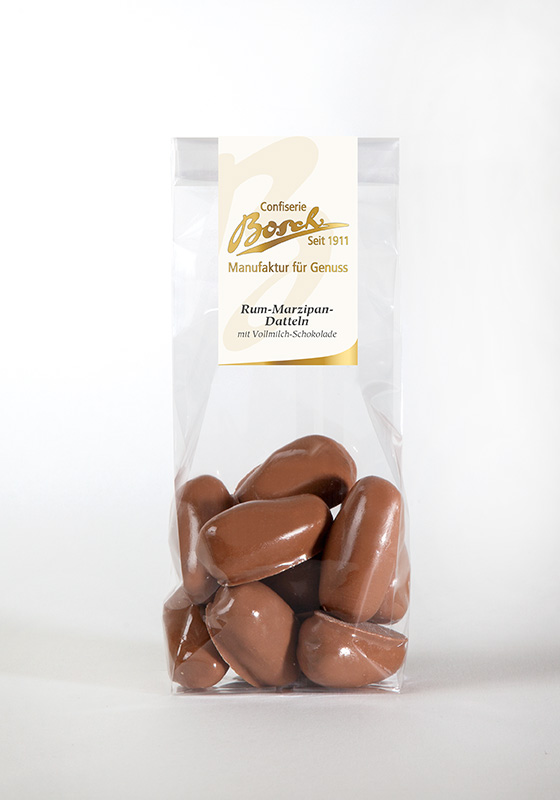 Datteln 40 %, Vollmilchschokolade, Kakao: 38 % mindestens (Zucker, Kakaobutter, Vollmilchpulver, Kakaomasse, Sahnepulver, Emulgator: Sojalecithin , Vanilleextrakt), Rum-Marzipan 14 % (Mandeln, Zucker, Wasser, Invertzuckersirup), Rum 2 %, Aroma, Feuchthaltemittel: Invertin.