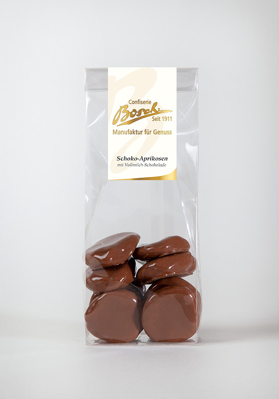 Ovale-rundliche Pralinen, Aprikosen mit heller Schokolade überzogen