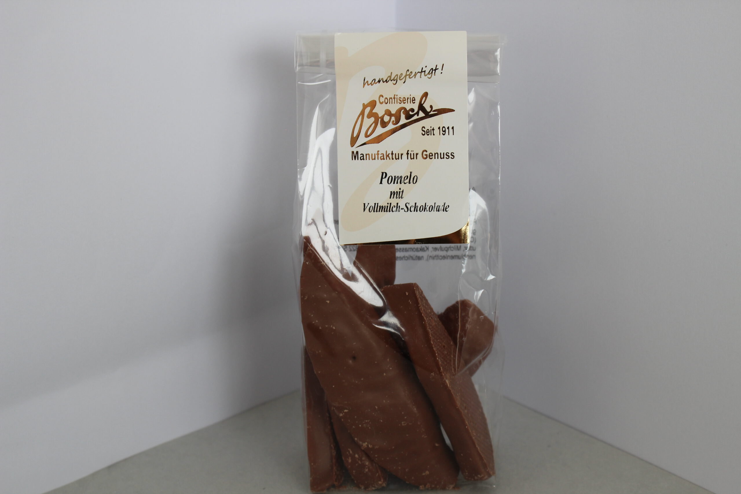 Pomelo getrocknet, gezuckert (Zucker, Pomelo, Säureregulator: E330 (Zitronensäure), Festigungsmittel: E509 (Calciumchlorid), Vollmilchschokolade, Kakao: 38 % mindestens (Zucker, Kakaobutter, Vollmilchpulver, Kakaomasse, Sahnepulver, Emulgator: Sojalecithin, Vanilleextrakt).
