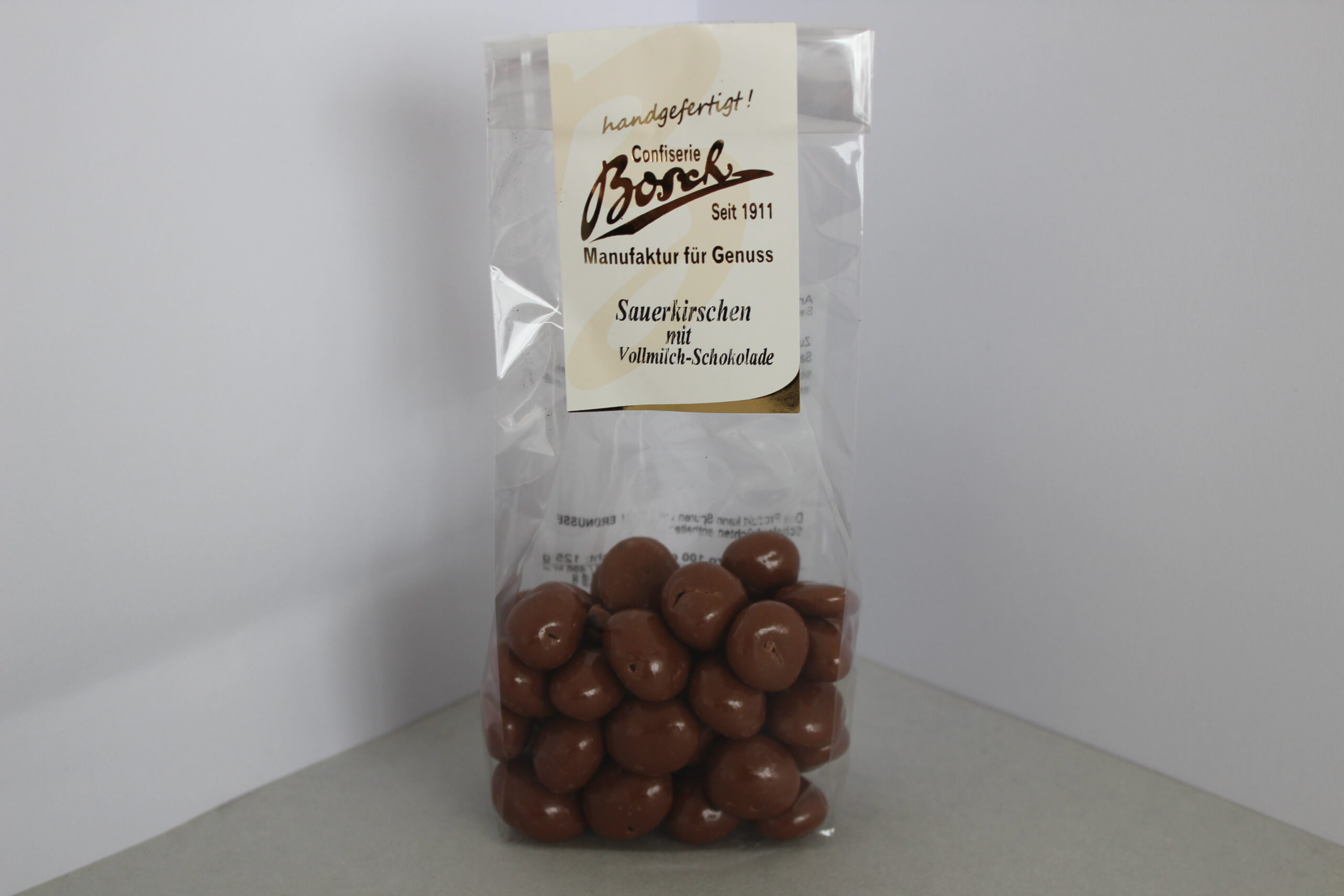 Sauerkirschen 50 %, Vollmilchschokolade Kakao: 38 % mindestens (Zucker, Kakaobutter, Vollmilchpulver, Kakaomasse, Sahnepulver, Emulgator: Sojalecithin, Vanilleextrakt)., Überzugsmittel: Gummi arabicum, Schellack.
