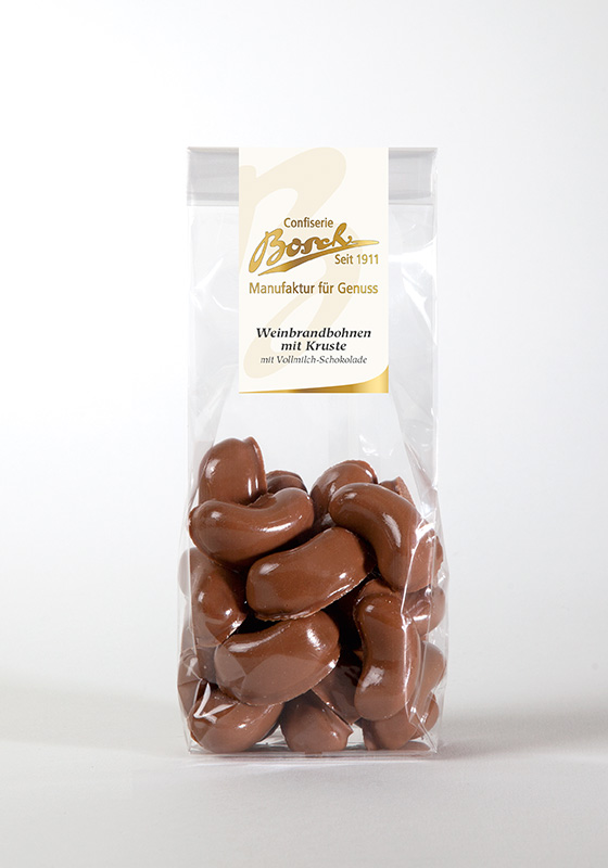 Weinbrandbohnen mit Kruste mit Vollmilchschokolade überzogen (Pralinen mit alkoholhaltiger Füllung)